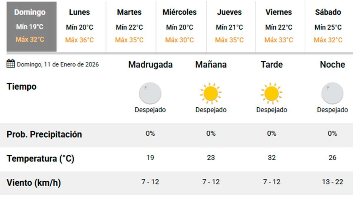 El Servicio Meteorológico Nacional (SMN) anticipa para este domingo 11 de enero una jornada cálida y agradable en Santiago del Estero, con condiciones ideales para actividades al aire libre. El cielo se mantendrá despejado durante gran parte del día y no se esperan lluvias, con una probabilidad de precipitaciones del 0%.