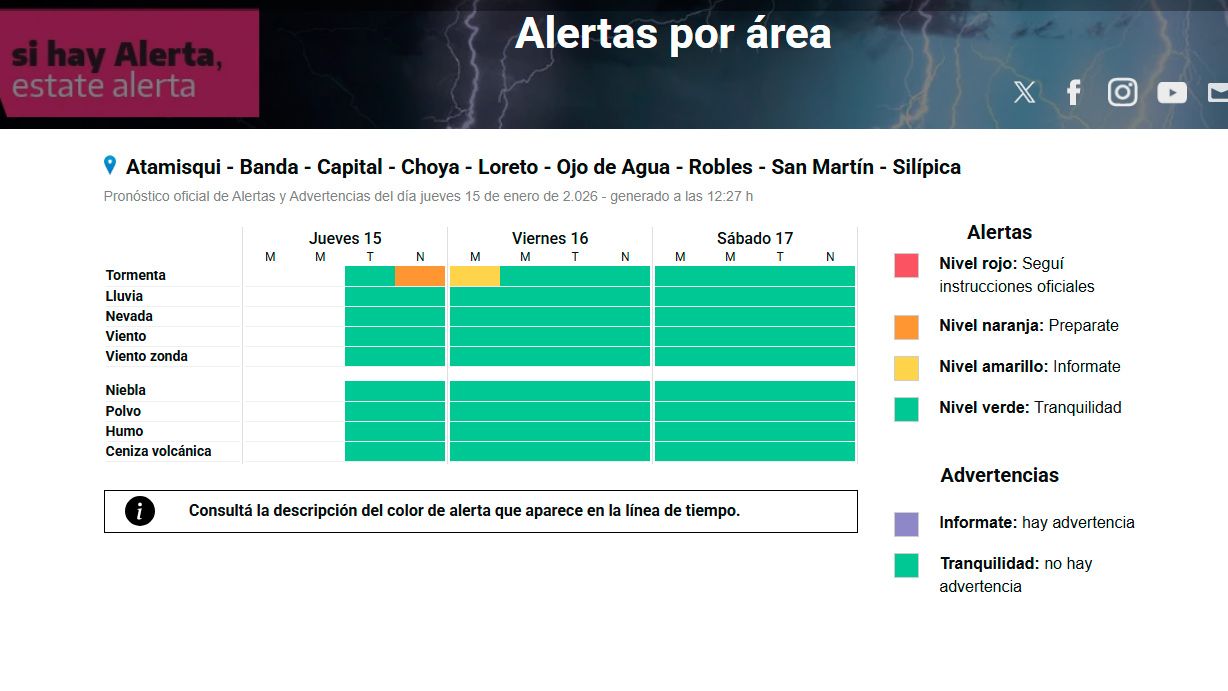 Asimismo el organismo nacional advierte, para este jueves por la noche y viernes por la madrugada, que podrían ocurrir tormentas severas, emitiendo un alerta Naranja y otro Amarillo, que afectarían a diversos departamentos de la provincia.