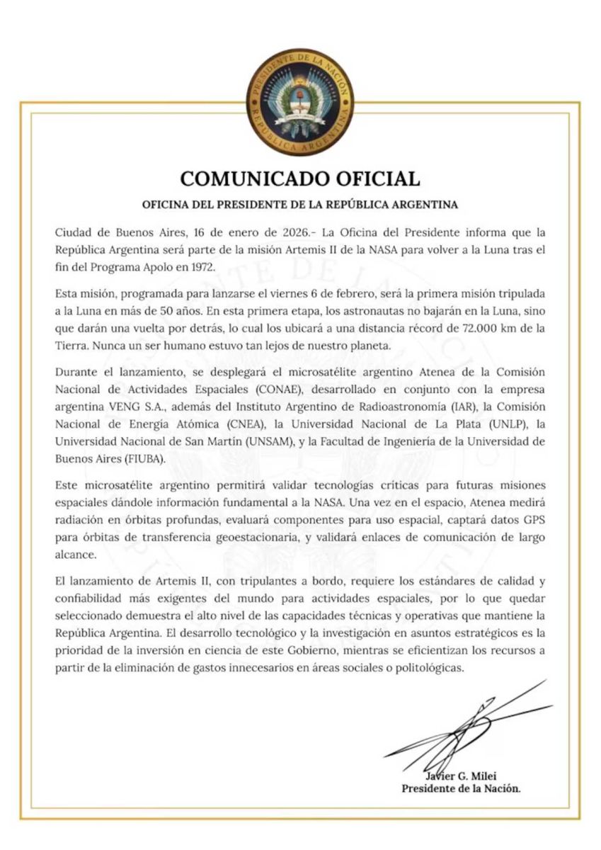 Asimismo, remarca que el lanzamiento del Artemis II, “requiere los estándares de calidad y confiabilidad más exigentes del mundo” para actividades espaciales, por lo que celebra la selección conforme a las capacidades técnicas y operativas del país. “El desarrollo tecnológico y la investigación en asuntos estratégicos es la prioridad de la inversión en ciencia de este Gobierno, mientras se eficientizan los recursos a partir de la eliminación de gastos innecesarios en áreas sociales o politológicas”, argumentan.