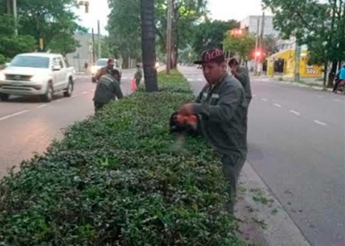 Estas acciones se desarrollan de forma periódica, buscando mantener la limpieza y la estética de los arbustos, canteros y césped de la principal vía de circulación de la ciudad.