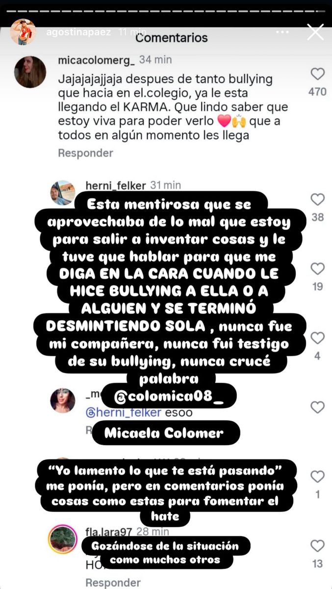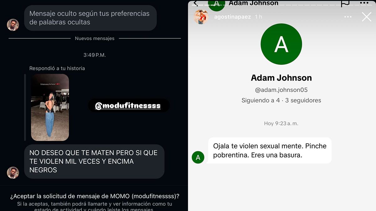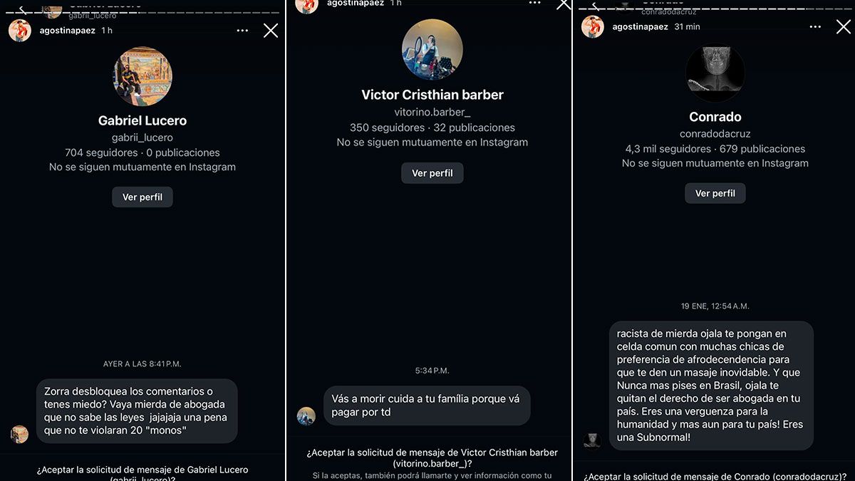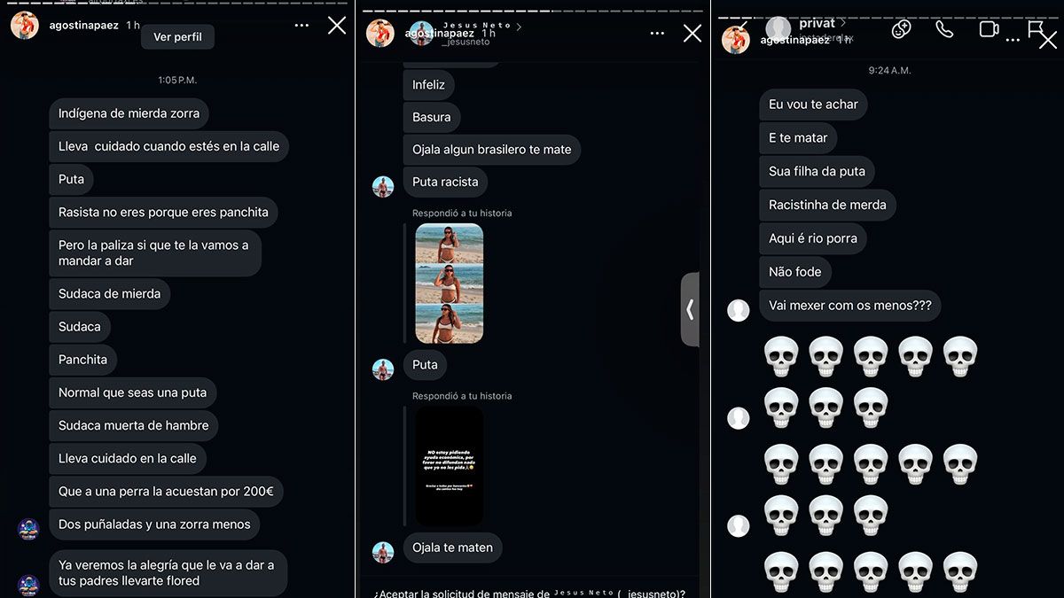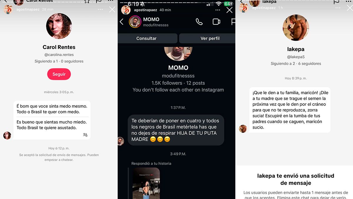 Las imágenes, compartidas en las historias de su cuenta de Instagram, muestran insultos, agravios y hasta amenazas de muerte hacia ella y a su familia provenientes de usuarios de distintos países. En los mensajes se observa un fuerte nivel de hostilidad, con comentarios tanto de brasileños como de argentinos y personas de otras nacionalidades.
