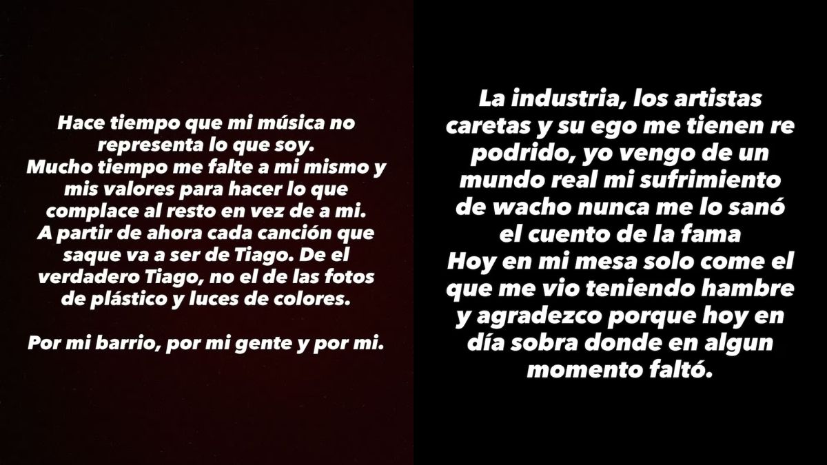 Hace tiempo que mi música no representa lo que soy. Mucho tiempo me falté a mí mismo y a mis valores para hacer lo que complace al resto en vez de a mí”, manifestó el oriundo de Montegrande en una story de letras blancas con fondo negro publicado en Instagram. Además, el joven añadió: “A partir de ahora, cada canción que saque va a ser de Tiago. Del verdadero Tiago. No el de las fotos de plástico y luces de colores”.