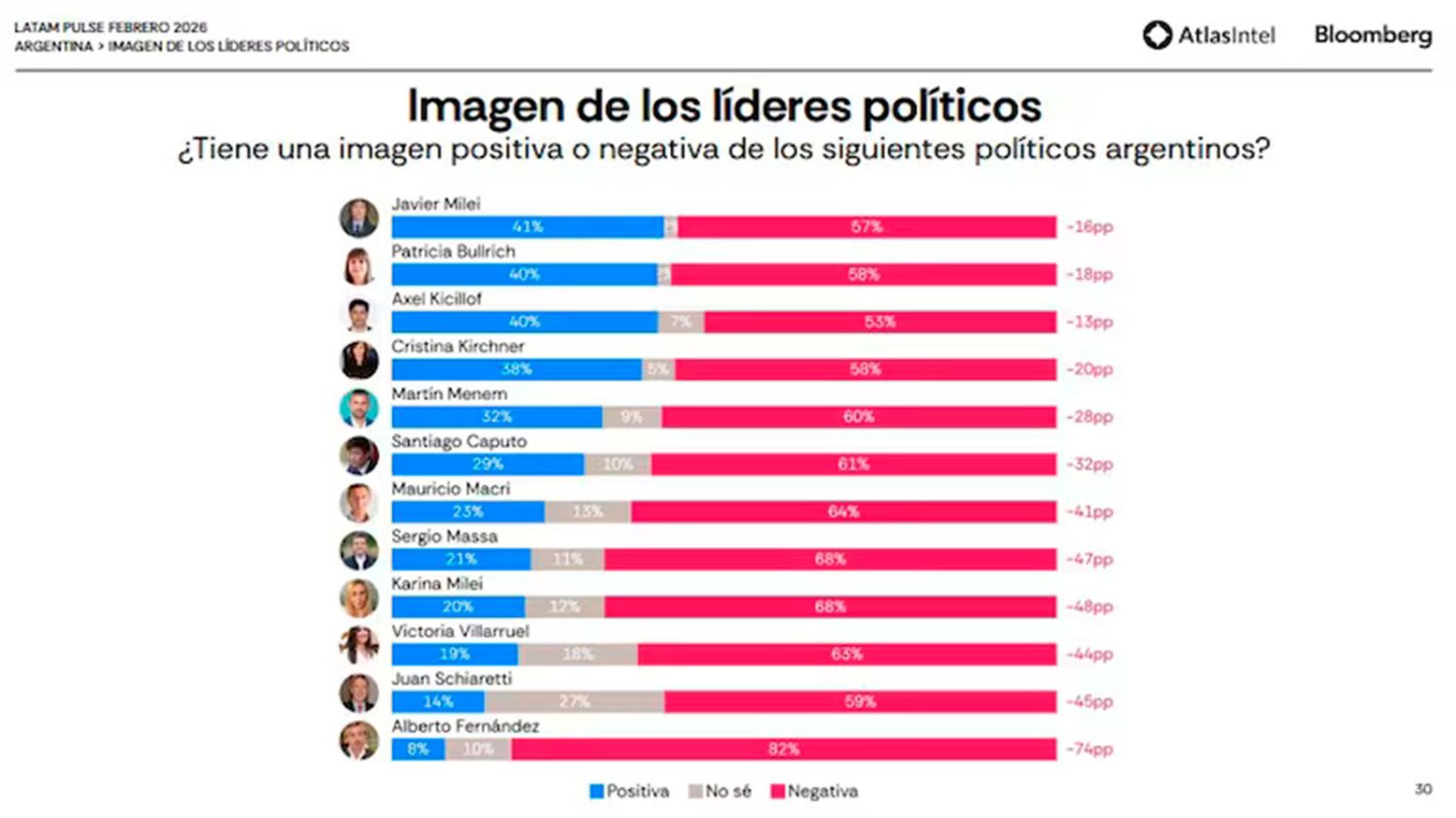 Las conclusiones se desprenden de una encuesta realizada por AtlasIntel y Bloomberg. La imagen negativa del Presidente llegó al 57%, su peor registro desde octubre de 2024.
