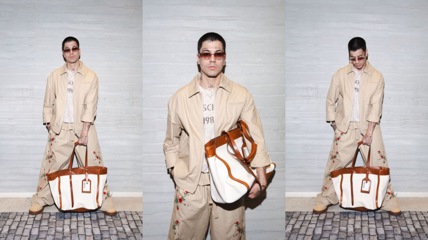 En el desfile de Moschino, Duki apostó por un look total beige con impronta urbana: campera liviana, pantalón ancho bordado con flores rojas y verdes y remera estampada. Completó el outfit con gafas oscuras y un bolso en tonos crudo y marrón, combinando streetwear con detalles sofisticados.