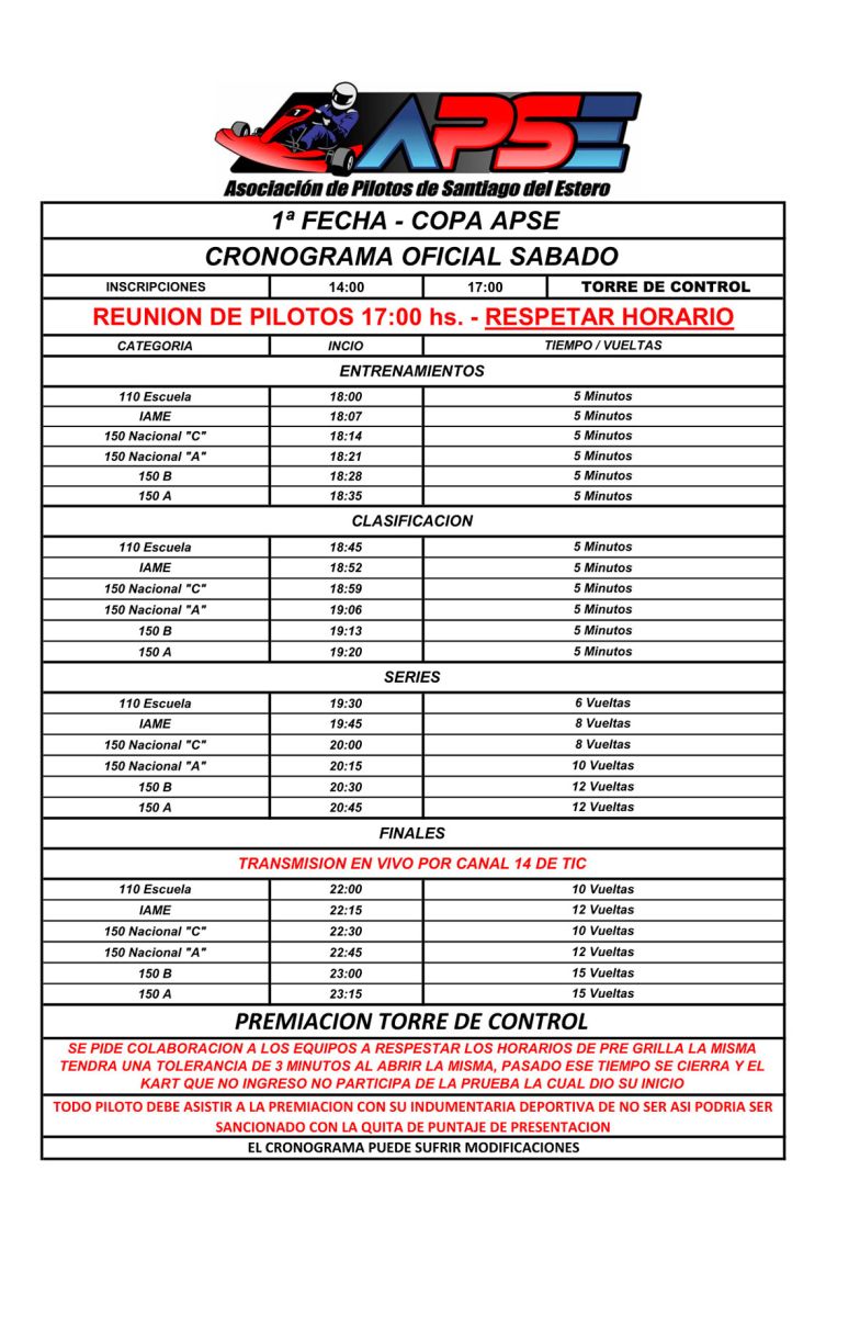 El cronograma del sábado comenzará con la reunión de pilotos a las 17 horas, paso obligatorio antes de salir a pista. Luego llegará el turno de los entrenamientos, que arrancarán a las 18 con la 110 Escuela, seguidos por la IAME 60, las categorías 150 Nacional C y A, y finalmente las divisionales 150 B y 150 A.