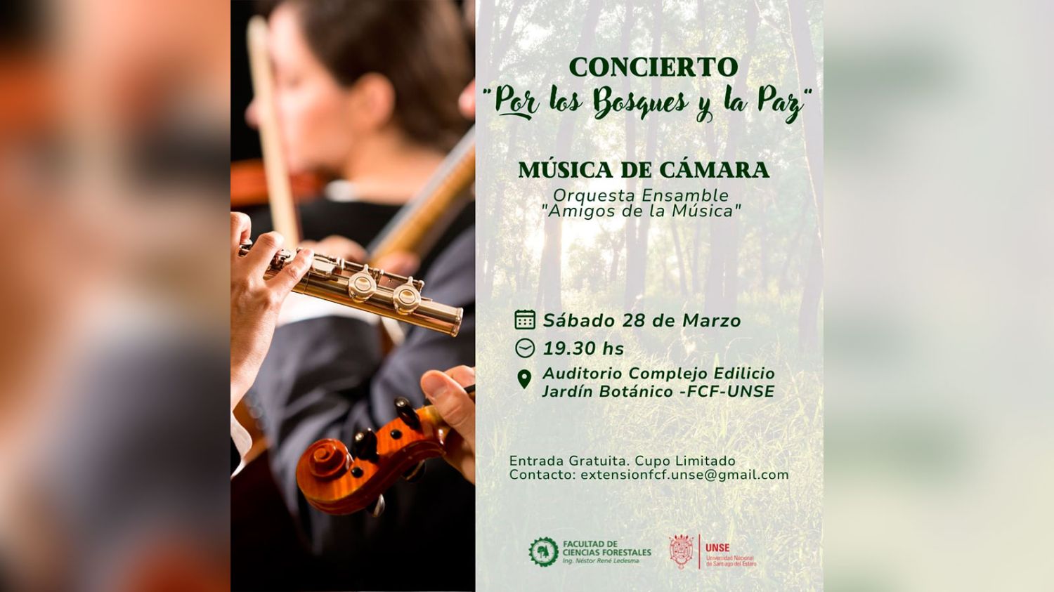 La Facultad de Ciencias Forestales de la Universidad Nacional de Santiago del Estero (UNSE) organiza el “Concierto por los Bosques y la Paz”, una propuesta cultural que combinará música de cámara y reflexión sobre el cuidado del ambiente. El evento se realizará el sábado 28 de marzo a las 19.30 horas en el Auditorio del Complejo Edificio Jardín Botánico de la FCF-UNSE.