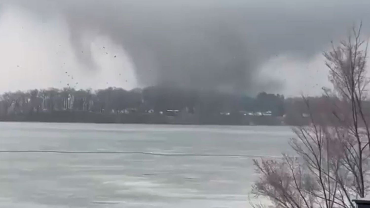 Lisa Piper estaba en la terraza trasera de su casa y grabó en video la aterradora escena que se producía al otro lado del helado lago Union, mientras se formaba una nube con forma de embudo que descendía hacia el suelo. Los árboles fueron arrancados de raíz y los escombros volaban por el aire.
