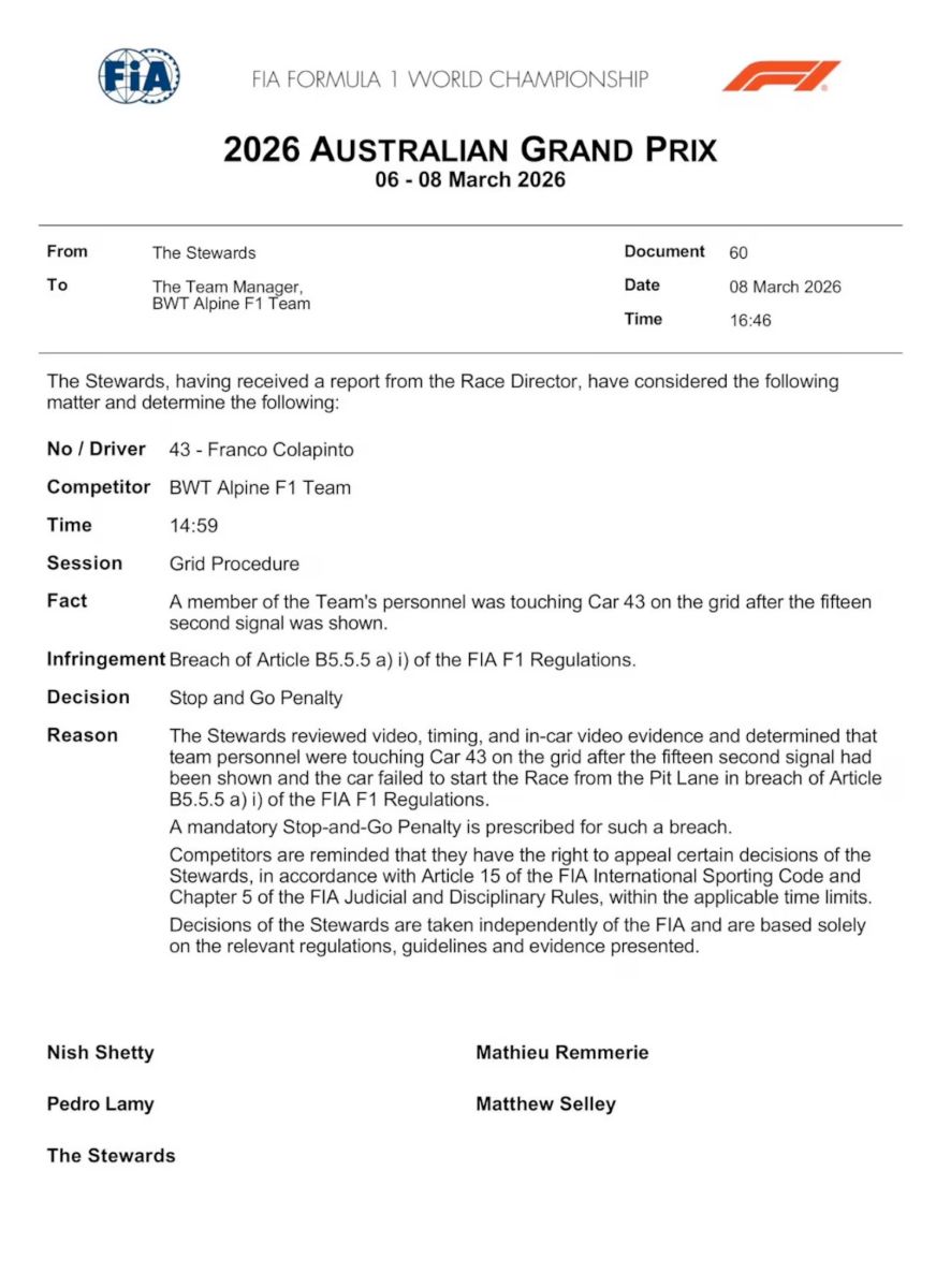 El director de carrera emitió el documento oficial en el que se detalla que el castigo se debió al ingreso indebido del personal del equipo a la pista y al incumplimiento de la señal final que ordena evacuar la parrilla antes de que se apaguen las luces del semáforo.