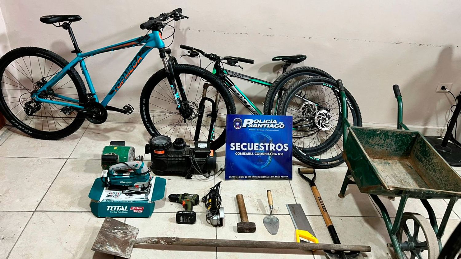 Asimismo, en otros procedimientos se recuperaron dos bicicletas —una marca Foxter rodado 29 de color negro con verde y otra marca Topmega de color celeste— además de una bomba de pileta marca Vulcano.