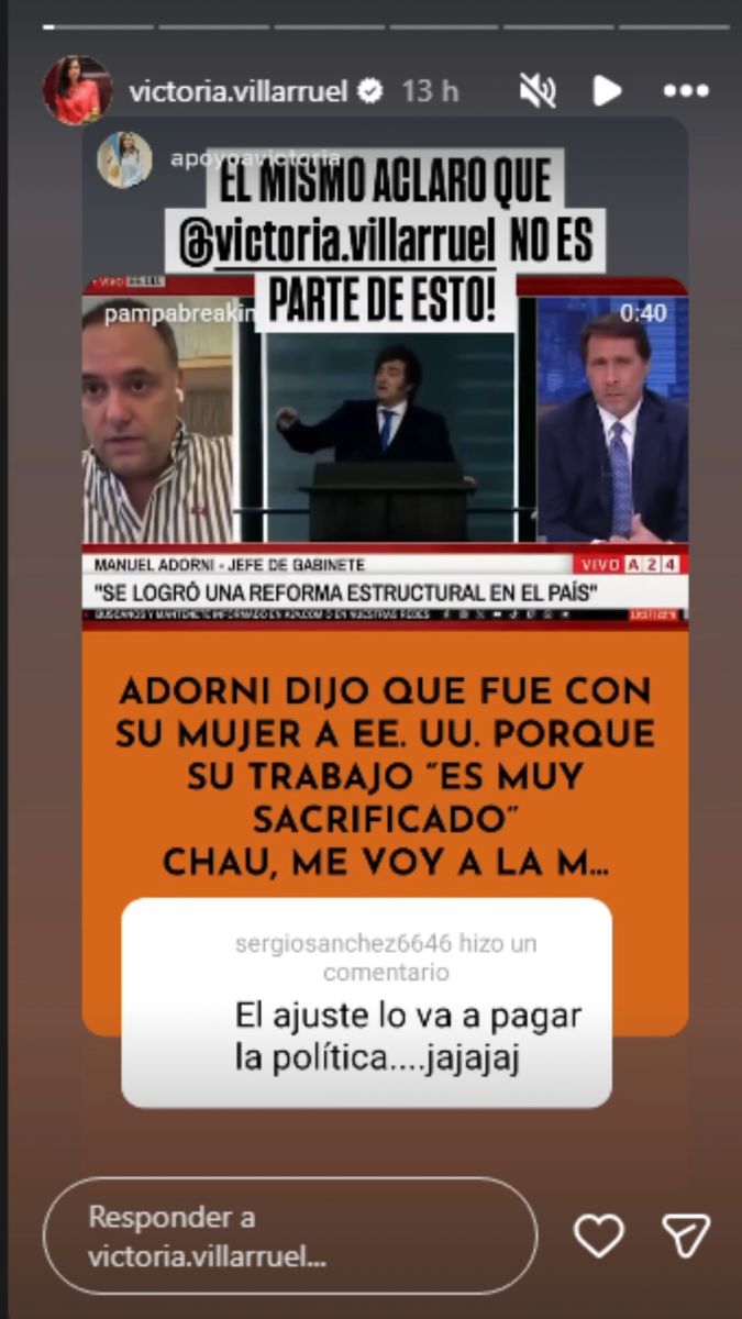 “El ajuste lo va a pagar la política... Jajaja”, dice un comentario posteado por otro usuario y replicado por la funcionaria en su cuenta de la red social Instagram junto a un video en el que el portavoz presidencial justifica que su esposa, Bettina Angeletti, haya viajado en el avión presidencial.