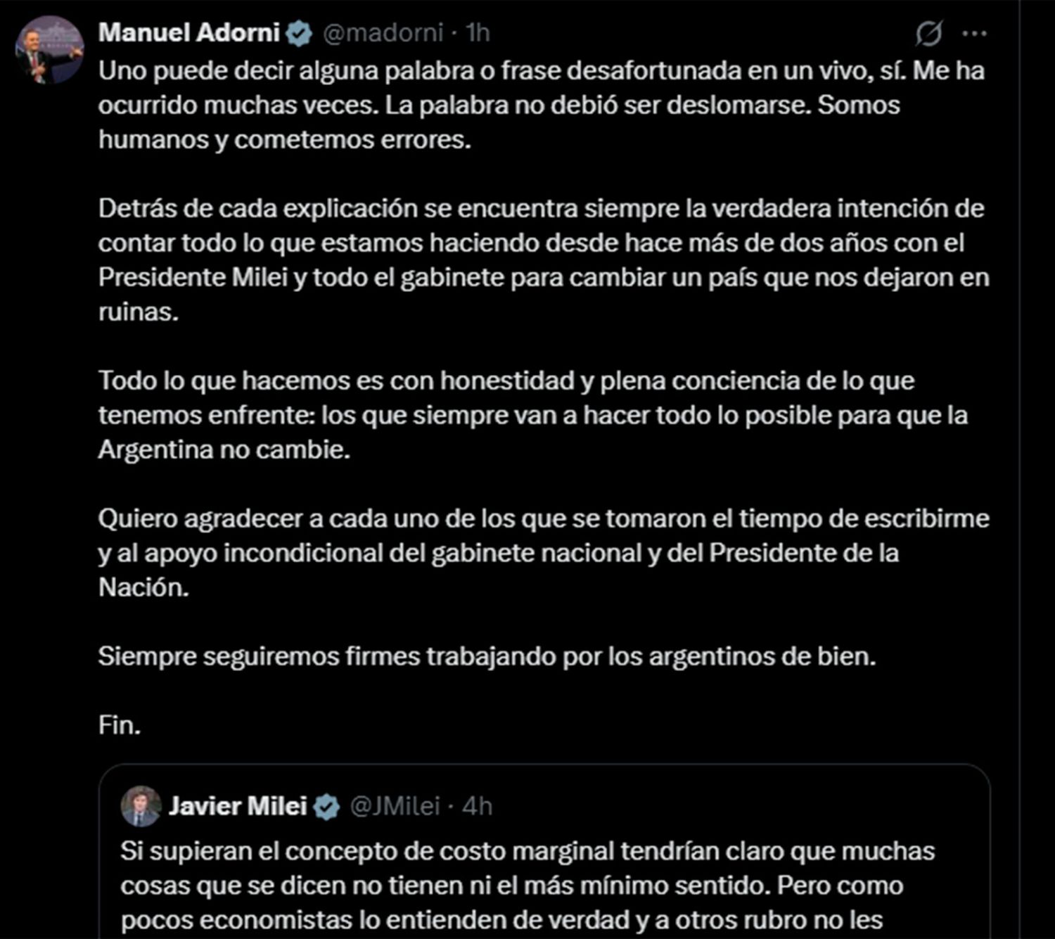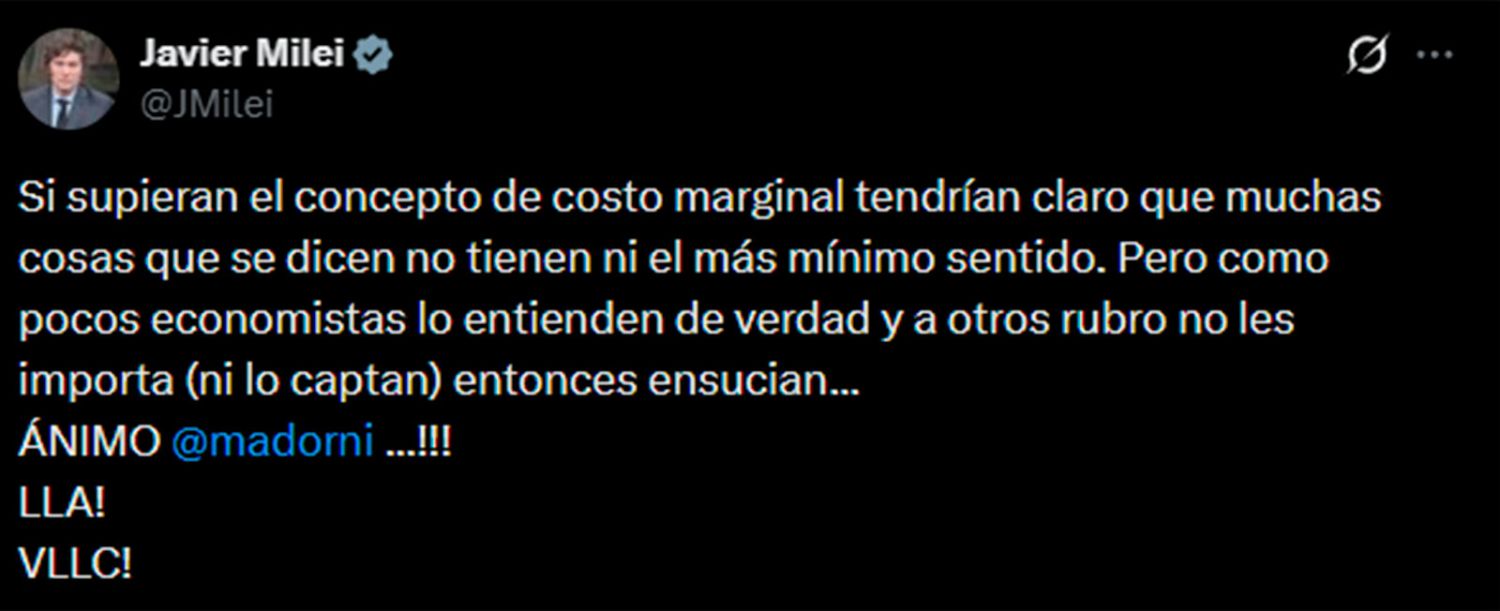 “Si supieran el concepto de costo marginal tendrían claro que muchas cosas que se dicen no tienen ni el más mínimo sentido. Pero como pocos economistas lo entienden de verdad y a otros rubro no les importa (ni lo captan) entonces ensucian... ÁNIMO @madorni...!!! LLA! VLLC!”, escribió el mandatario en sus redes sociales.