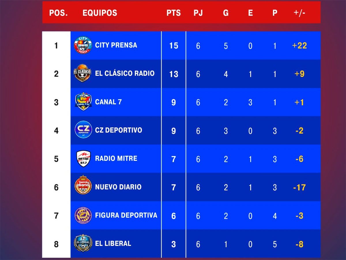 La sexta jornada del Torneo Interprensa dejó movimientos importantes en la tabla. Prensa City fue el gran ganador del jueves, ya que goleó por 16 a 5 a Nuevo Diario y, además, se vio beneficiado por el empate 3 a 3 en el clásico entre El Clásico Radio y Canal 7, resultado que le permitió quedar como único puntero del certamen.