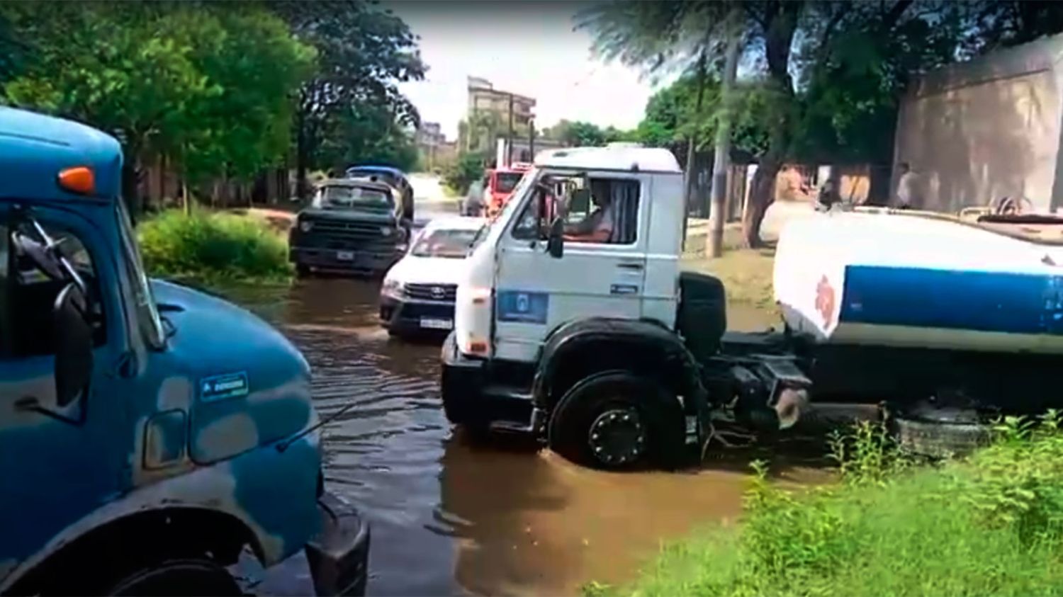 Personal de Defensa Civil y distintas áreas del municipio trabajan con bombas y camiones cisterna para retirar el agua acumulada tras las lluvias.