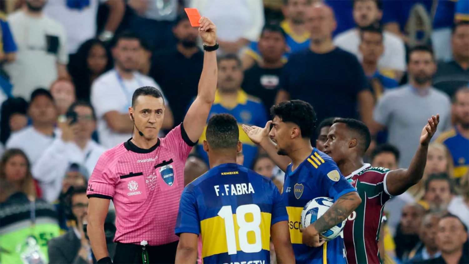 “Yo veo que el jugador de Fluminense se mete con mi compañero y yo meto la mano y desafortunadamente lo rozo, no lo toco”, explicó Fabra sobre la jugada que derivó en su tarjeta roja.
