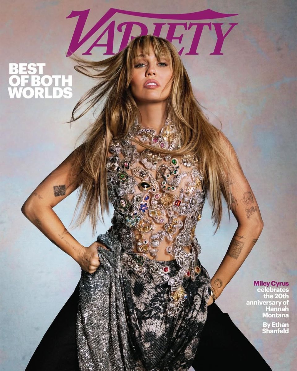 Una de las imágenes elegidas por Miley Cyrus para la portada de Variety la muestra con una prenda superior construida a partir de una red de broches, cristales y gemas de colores, que funciona como una “armadura” brillante y sofisticada. Esta pieza, combinada con pantalones oscuros y una falda de encaje con pedrería, marca el paso del vestuario juvenil y colorido de Hannah Montana a un glamour gótico y adulto.