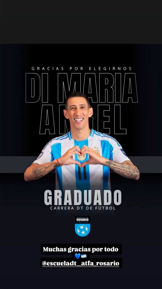 “Felicitaciones DT. Con enorme orgullo felicitamos a Di María por su título y le agradecemos haber confiado en nosotros para formarse como entrenador”, publicaron junto a una imagen del futbolista con la camiseta albiceleste.