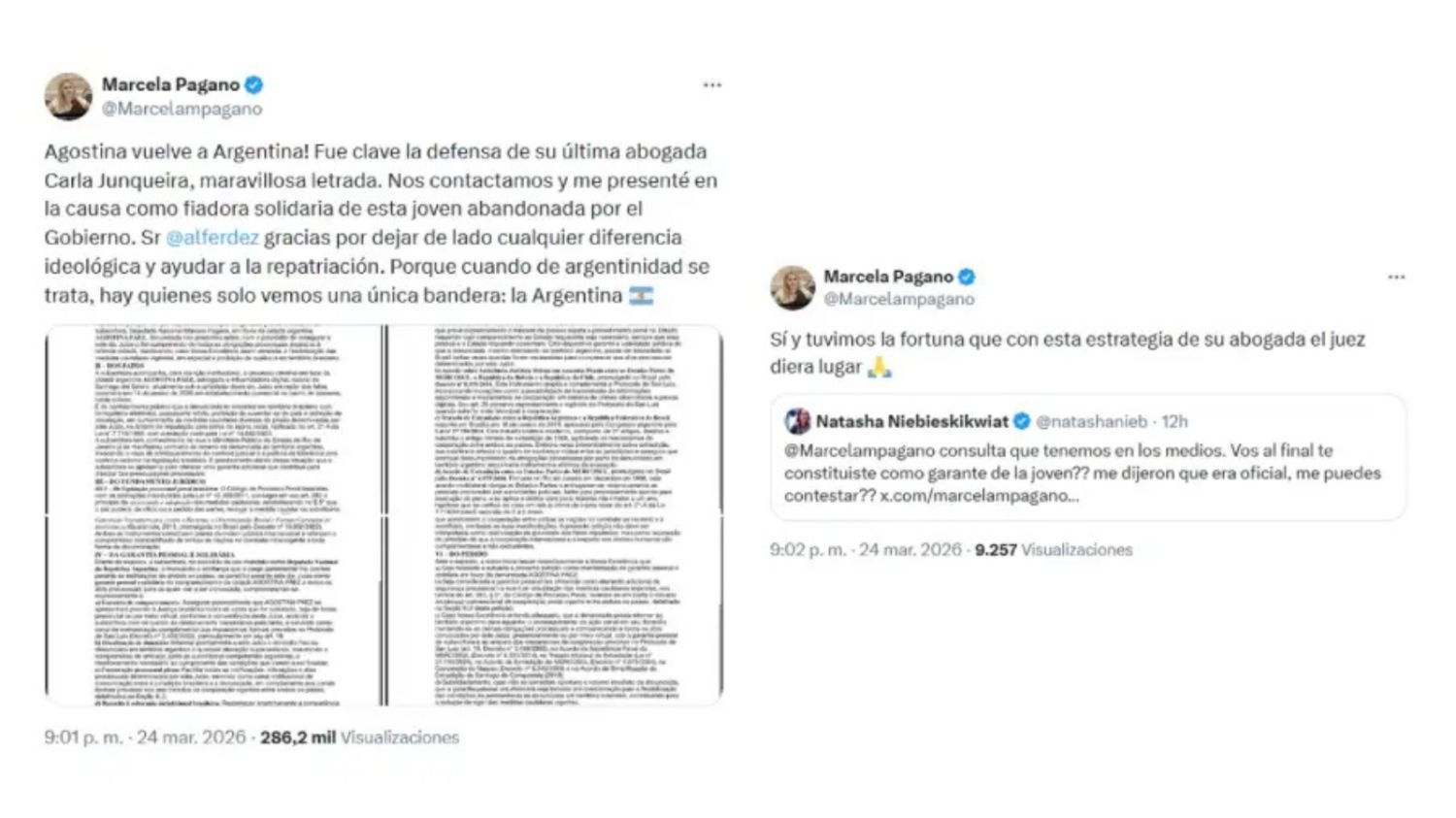En otra publicación a través de X, la legisladora amplió: "Agostina vuelve a Argentina! Fue clave la defensa de su última abogada Carla Junqueira, maravillosa letrada. Nos contactamos y me presenté en la causa como fiadora solidaria de esta joven abandonada por el Gobierno"