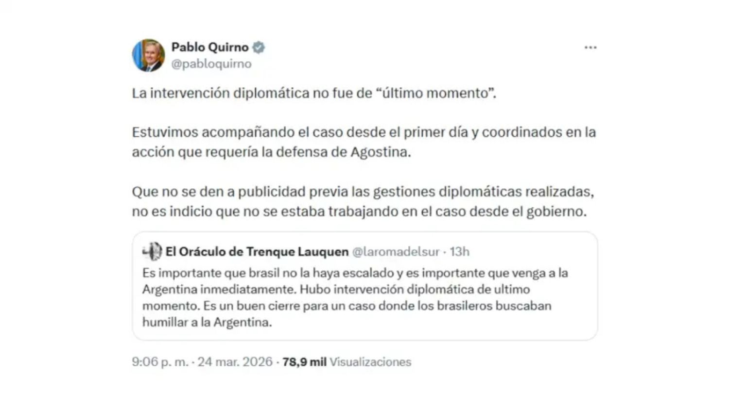"La intervención diplomática no fue de 'último momento'. Estuvimos acompañando el caso desde primer día y coordinamos en la acción que requería la defensa de Agostina. Que no se den a publicidad previa las gestiones diplomáticas realizadas, no es indicio que no se estaba trabajando en el caso desde el gobierno", sostuvo el funcionario vía X.