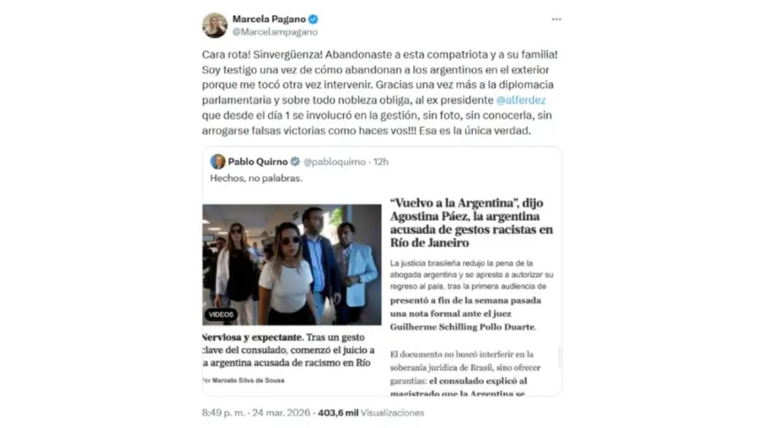 El cruce comenzó cuando el ministro de Relaciones Exteriores, Pablo Quirno, compartió una publicación con la leyenda "hechos, no palabras", destacando el giro en el caso de Páez, y un usuario señaló que hubo "intervención diplomática de último momento".