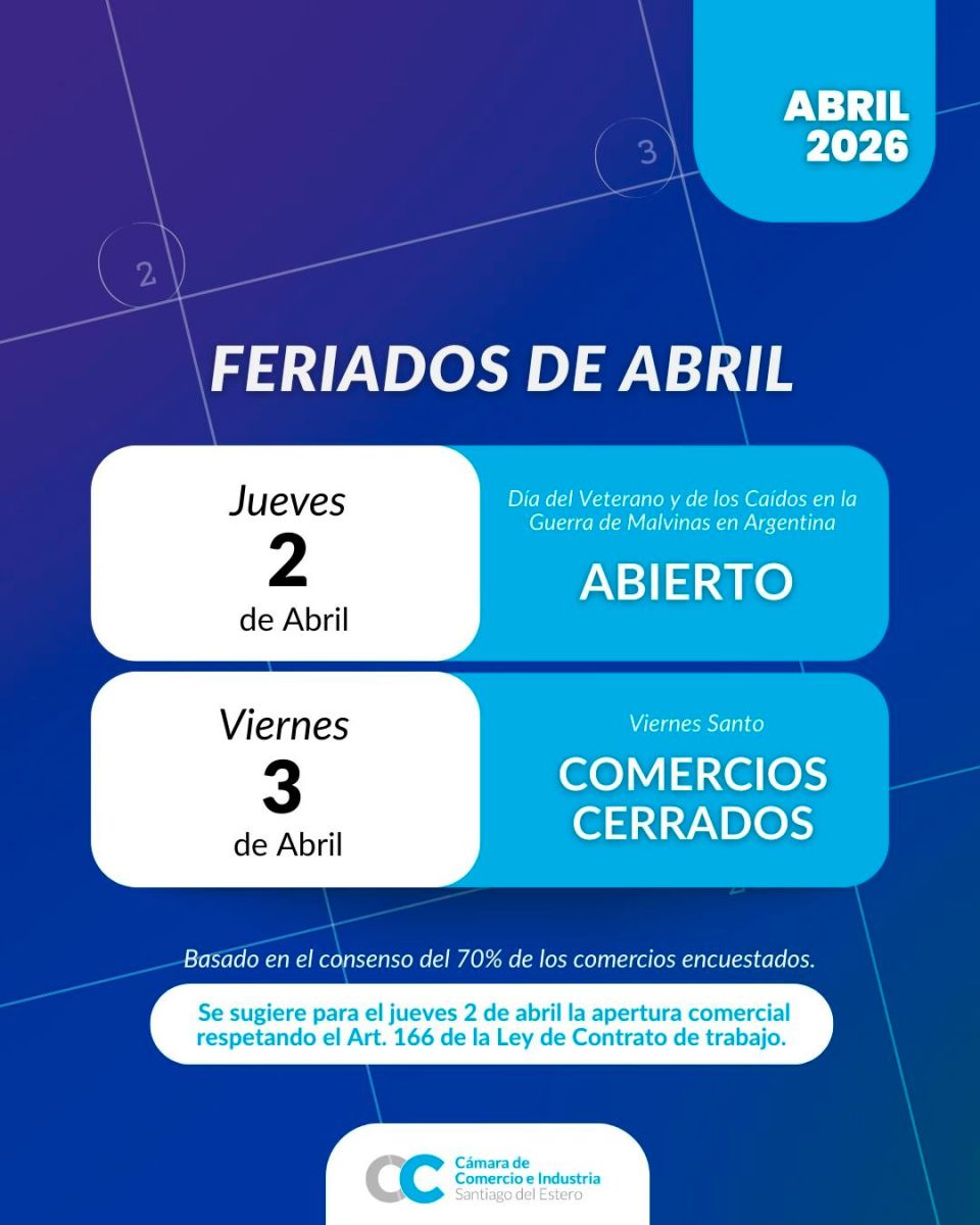 Según lo comunicado, el jueves 2 de abril, en el marco del Día del Veterano y de los Caídos en Malvinas, la actividad comercial será normal, con apertura de los locales y cumplimiento de la legislación vigente, que establece el pago doble para jornadas feriadas.