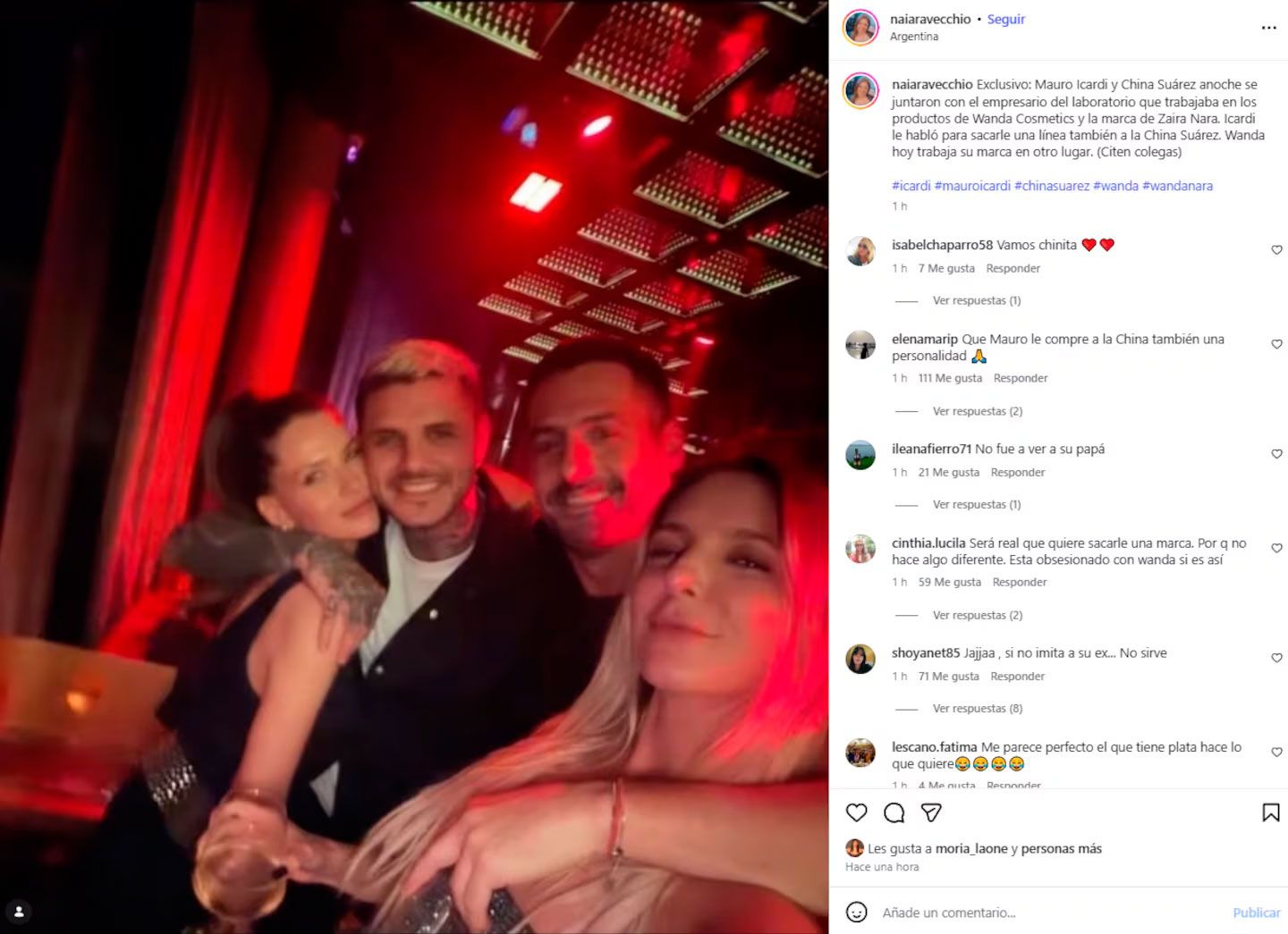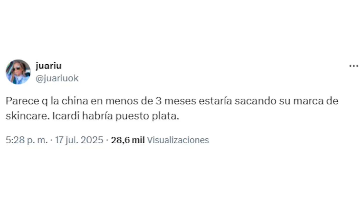 “Exclusivo: anoche se juntaron con el empresario del laboratorio que trabajaba en los productos de Wanda Cosmetics y la marca de Zaira Nara”, escribió. Y sumó: “Icardi le habló para sacarle una línea también a la China Suárez”.