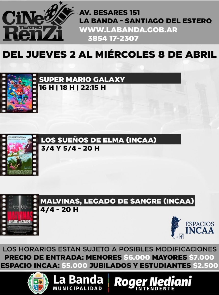 Además, la cartelera incluye producciones del Espacio INCAA, promoviendo el cine nacional con la proyección de “Los Sueños de Elma”, que podrá verse los días 3 y 5 de abril a las 20:00, y “Malvinas, Legado de Sangre”, que se exhibirá el 4 de abril en el mismo horario.
