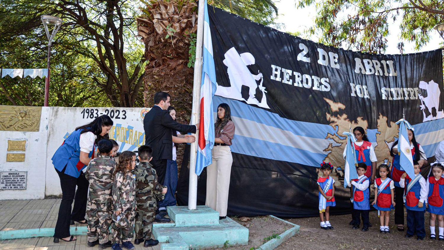 La ceremonia se realizó en la Plaza Malvinas Argentinas, en coordinación con los Jardines de Infantes Municipales “Mis Pimpollos” y “Mundo Feliz”, donde se rindió honores a los héroes de Clodomira que ofrendaron su vida en el campo de batalla, como también a quienes regresaron y mantuvieron vivo el espíritu patriótico en defensa de la soberanía argentina.