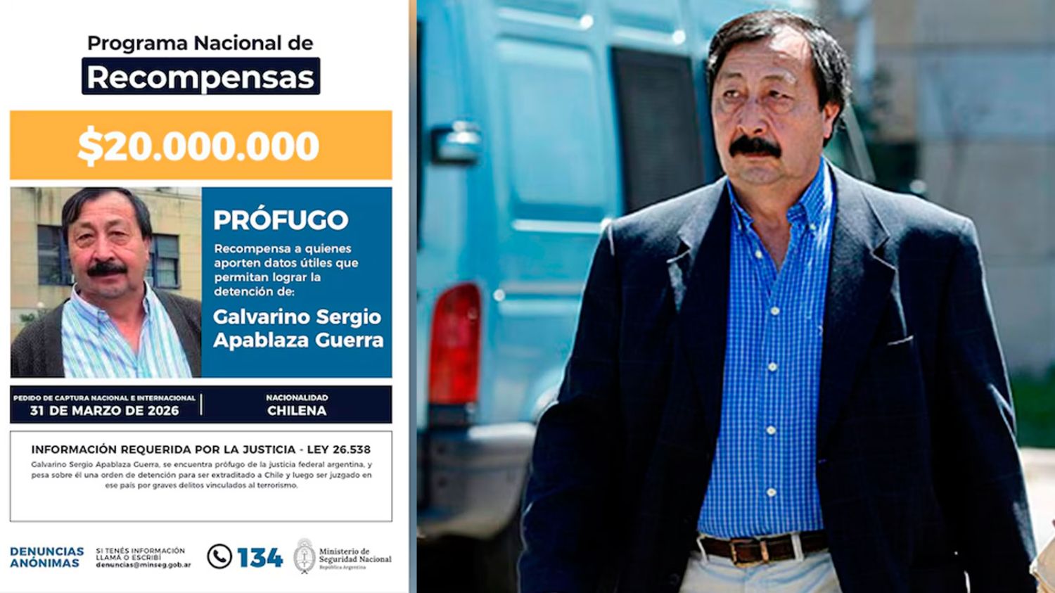 El gobierno nacional, a través del Ministerio de Seguridad, dispuso una recompensa de 20 millones de pesos para las personas que brinden datos útiles que permitan lograr la captura de Galvarino Sergio Apablaza Guerra, el exguerrillero chileno que vivía en la localidad bonarense de Moreno, y que ahora se encuentra prófugo de la Justicia, y al que Chile busca extraditar hace años.