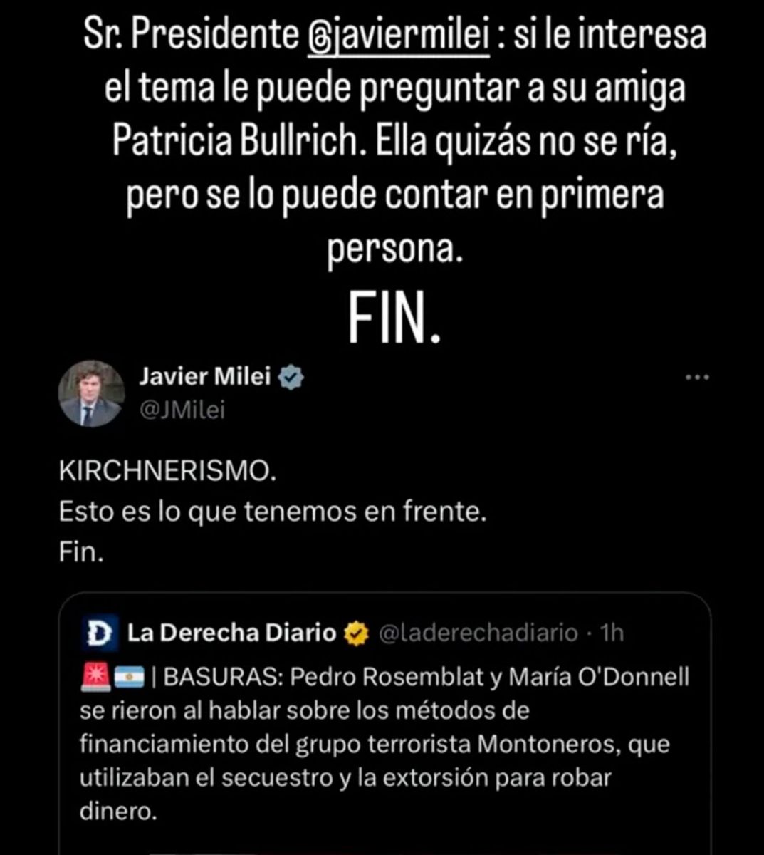 Lejos de esquivar la polémica, Rosemblat recogió el guante y respondió públicamente con un mensaje cargado de ironía. “Presidente, si le interesa el tema, le puede preguntar a su amiga Patricia Bullrich”, escribió, en alusión directa a la funcionaria.