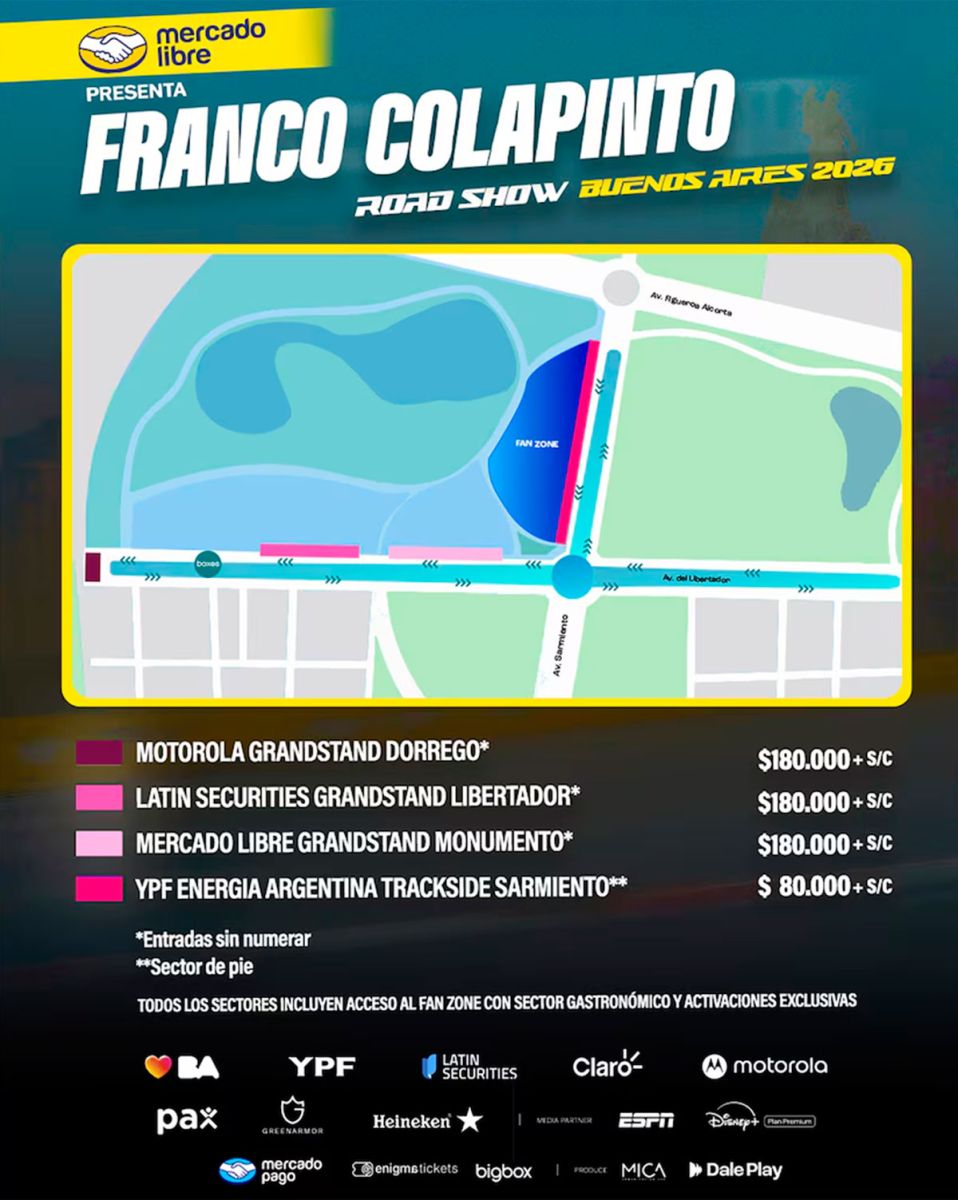 Se dieron a conocer los valores de las entradas para la esperada exhibición de Franco Colapinto en la ciudad de Buenos Aires, donde el piloto argentino se presentará a bordo de un auto de Fórmula 1 el domingo 26 de abril.