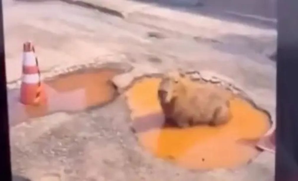 El muchacho generó una imagen en la que una capibara se encontraba acostada dentro del bache, simulando disfrutar de una pequeña piscina improvisada en plena calle.