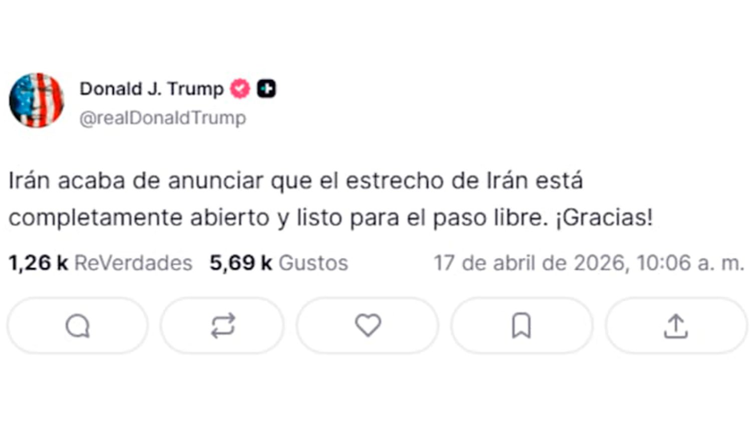 “Irán acaba de anunciar que el estrecho de Irán está completamente abierto y listo para el paso libre. ¡Gracias!“, festejó el mandatario republicano.