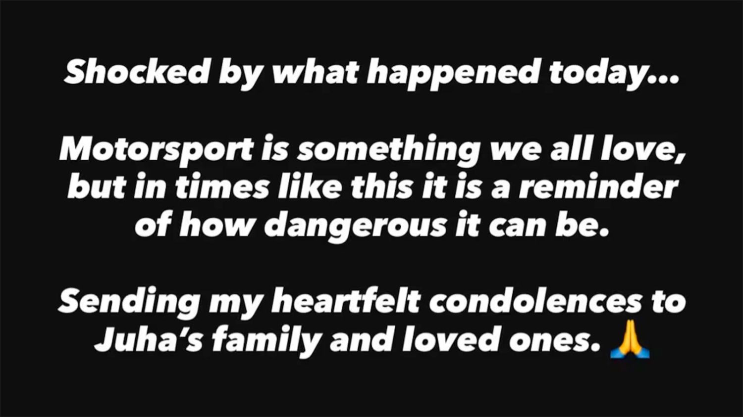 “Conmocionado por lo que pasó hoy. El automovilismo es algo que todos amamos, pero en momentos como este nos recuerda lo peligroso que puede ser. Envío mis más sinceras condolencias a la familia y seres queridos de Juha”.