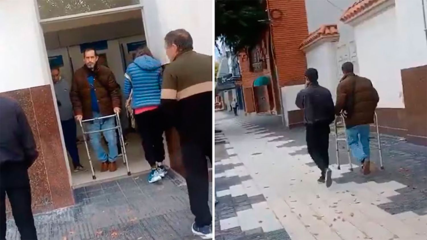 El registro muestra al individuo desplazándose lentamente con un andador dentro de la sucursal, ubicada en la intersección de avenida San Martín y Garibaldi. Sin embargo, al salir, se lo observa caminando sin dificultad, acompañado por otra persona.
