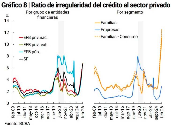 En detalle, la mora de las familias acumuló un deterioro prácticamente ininterrumpido durante el último año. La misma pasó de 2,9% en febrero de 2025 al actual 11,2%, lo que refleja la fuerte presión sobre la capacidad de pago. Los mayores incrementos se verificaron en los préstamos personales, donde la irregularidad escaló al 13,8%, y en las tarjetas de crédito, que alcanzaron el 11,6%.