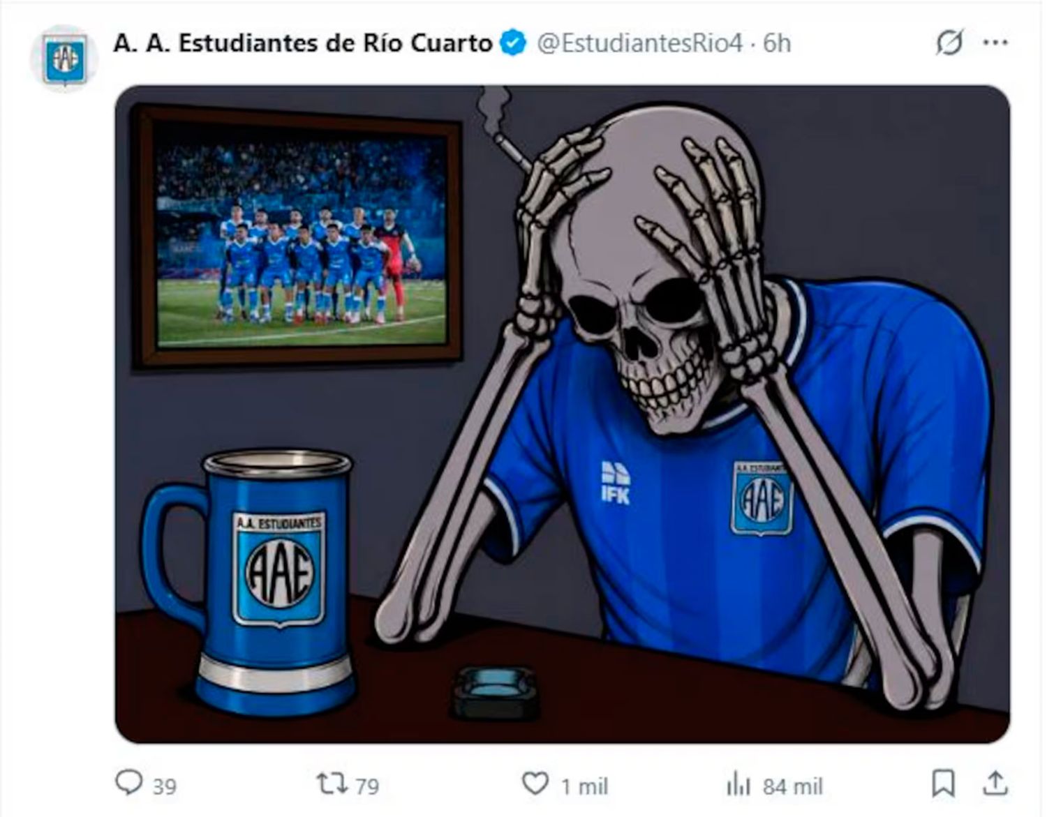 La imagen mostraba una calavera fumando, tomándose la cabeza, mientras de fondo aparecía una televisión con la imagen de once jugadores del plantel, en una clara asociación del equipo con la muerte.