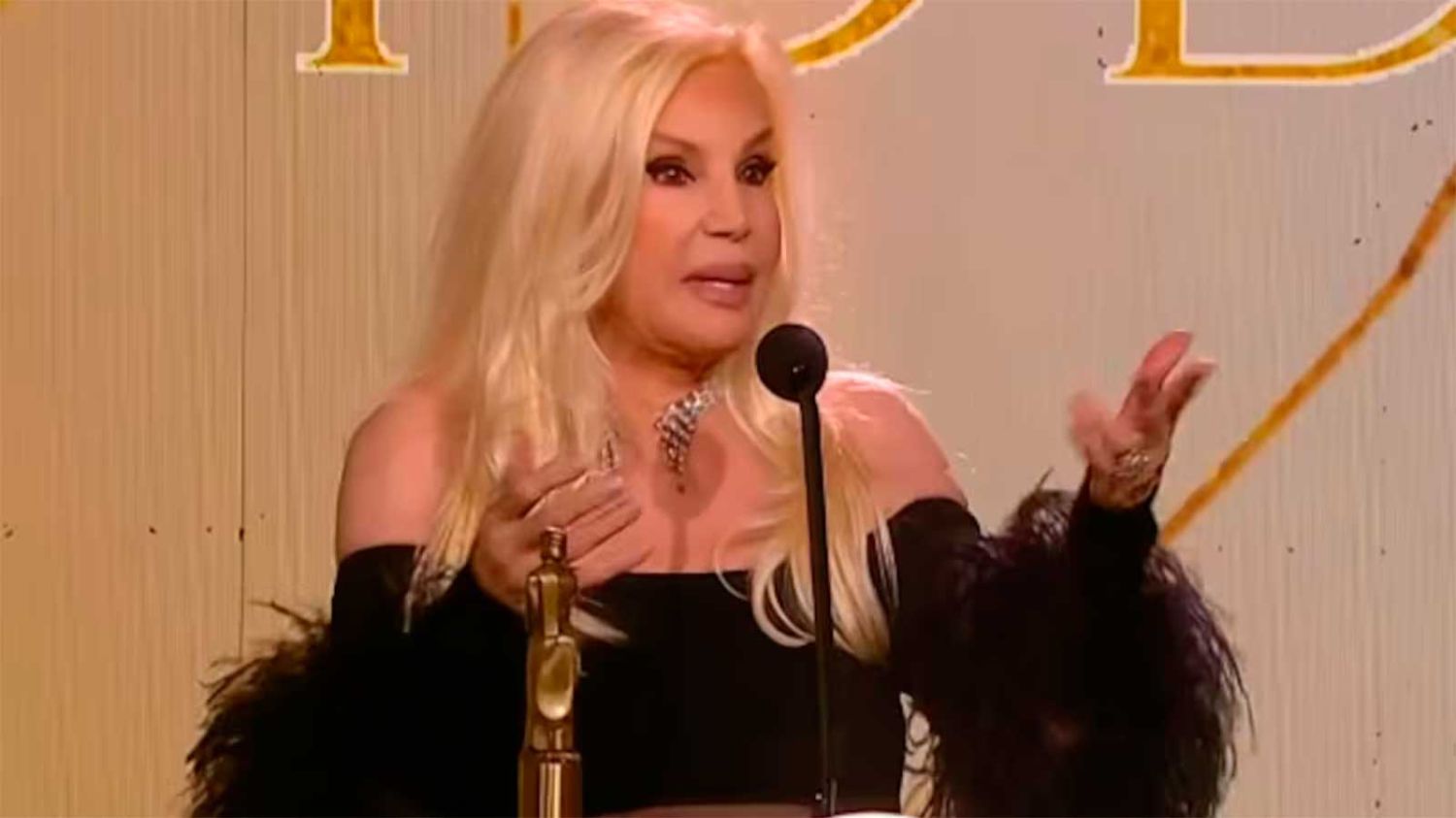 Relajada y con su desparpajo de siempre, la diva aprovechó la oportunidad para hacerle un pase de factura a Aptra. ”Es la primera vez que me dan el Martín Fierro de la Moda. No sé si este es el cuarto año… nunca me lo dieron”, bromeó. Después agradeció la puesta en escena. “La verdad es que fue tan impresionante que me quedé muda. Tuve que tomar agua en cámara. Me quedé… Es brutal lo que hicieron”, señaló.