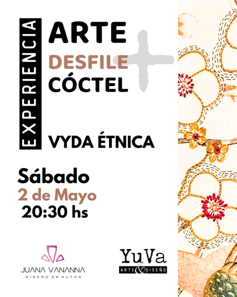 La escena artística y de diseño local tendrá una cita destacada este sábado 2 de mayo con la realización del desfile “Vyda Étnica”, una propuesta que conjuga moda, arte y encuentro en un mismo espacio. La actividad comenzará a las 20.30 en la galería de arte Yuva, ubicada en Alsina 771.