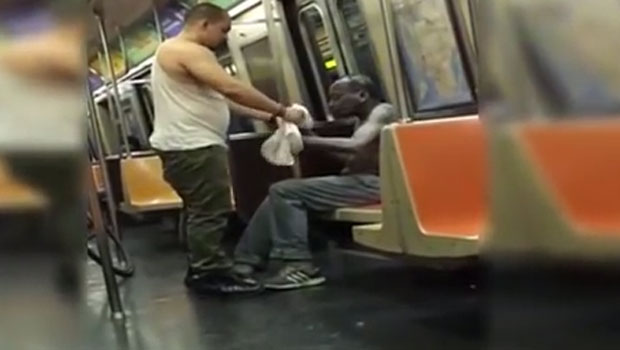Este vídeo, grabado en el Metro de Nueva York, muestra a un hombre que se quita la camiseta y se acerca a un mendigo para dársela. Incluso, como se observa en las imágenes, decide ayudarle a ponérsela y le entrega un gorro de lana.