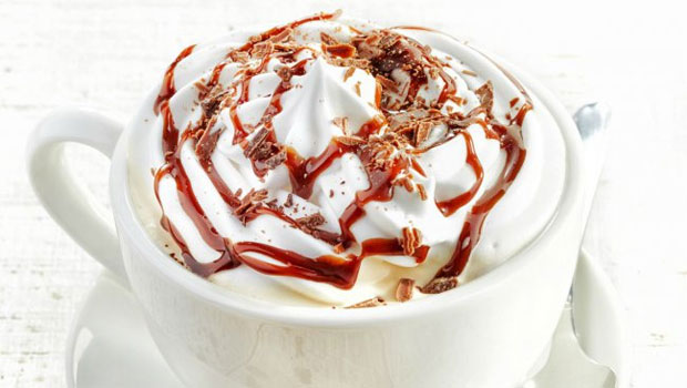 Por último, sirve la preparación en tazas, agrega crema batida encima, canela en polvo y algunos chips de chocolate blanco.